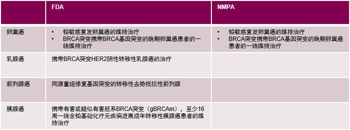 既往的临床研究发现,奥拉帕利不仅对于BRCA突变铂敏感复发卵巢癌有显著临床获益,实际上对于占复发卵巢癌70%在铂敏感复发患者也有显著临床获益,同样在前列腺癌中发现BRCA突变率低,但存在大量的HRR基因的突变,后续的临床研究进一步发现对于存在20%-30%HRR突变的激素抵抗前列腺癌,奥拉帕利也存在显著的临床获益。在今年的5月20日,FDA刚刚批准奥拉帕利用于治疗同源重组修复基因突变的转移性去势抵抗性前列腺(表1)。以上基础和临床研究均证实了PARPi不仅对于BRCA突变人群有显著临床获益,对于更大范围的HRD/HRR人群的也存在临床获益。