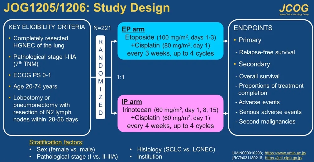 日本静冈癌症中心胸部肿瘤科Hirotsugu Kenmotsu 等开展的JCOG1205/1206是一项III期随机对照研究,旨在评估伊立替康+顺铂(IP方案)对比依托泊苷+顺铂(EP方案)治疗完全切除的肺部高级别神经内分泌癌的疗效。WHO分型中,小细胞肺癌(SCLC)和大细胞神经内分泌癌(LCNEC)被认为是肺的高级别神经内分泌癌(HGNEC)。虽然没有随机试验评估手术切除的HGNEC的患者的辅助化疗方案,但EP被认为是该人群的标准方案。