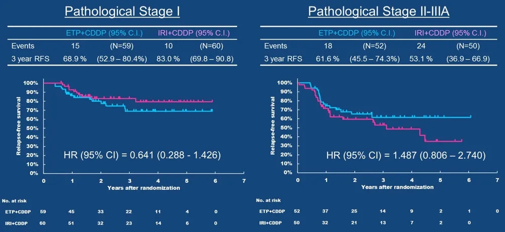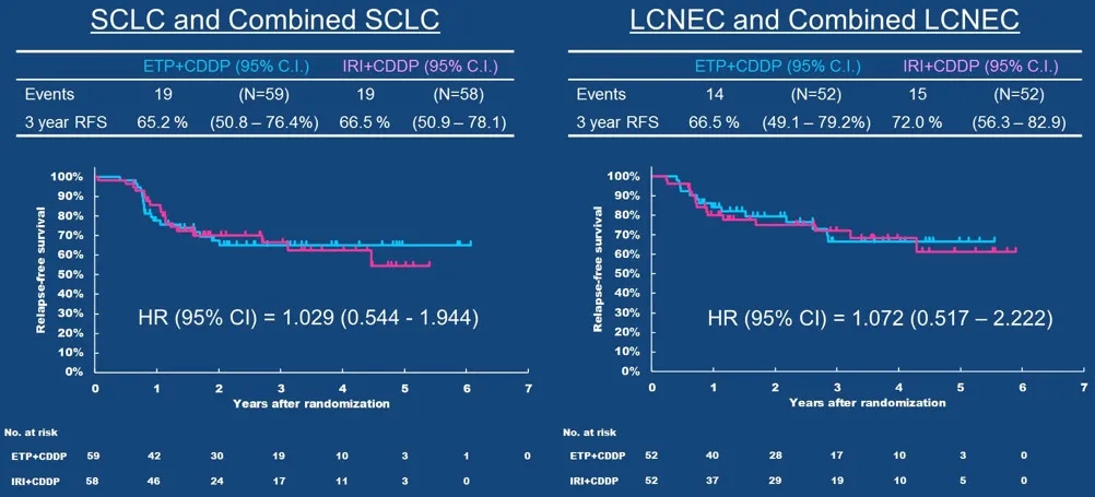 亚组分析显示,在小细胞肺癌亚组,患者接受EP和IP治疗的3年RFS率分别为65.2%和66.5%(HR=1.029,95%CI: 0.544-1.944),在肺大细胞神经内分泌癌亚组,EP和IP方案的3年RFS分别为66.5%和72.0%(HR=1.072,95%CI: 0.517-2.222)。