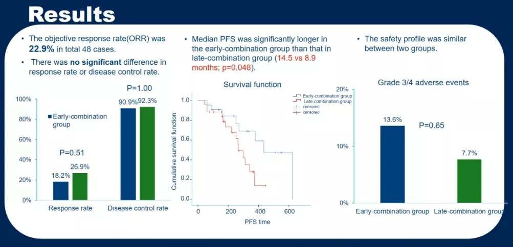 结果:最终纳入48例u-HCC患者。所有患者的中位随访时间为9.3(5.3~14.3)个月。两组患者基线特征相似。早期联合组(n=22)和晚期联合组(n=26)平均年龄分别为65±9.7岁和61±11.6岁(P=0.2),BCLC期C型HCC分别为59%和54%(P=0.89), Child-Pugh A比例分别为81.8%和77%(P=0.73)。48例患者客观有效率(ORR)为22.9%。两组患者缓解率(18.2% vs. 26.9%,P=0.51)和疾病控制率(90.9% vs. 92.3%,P=1.00)方面无显著性差异。早期联合组的中位PFS明显长于联合晚期组(14.5 vs. 8.9个月;P=0.048)。两组患者的安全性相似。3~4级不良事件3例(13.6%),2例(7.7%)(P=0.65)(图5)。
