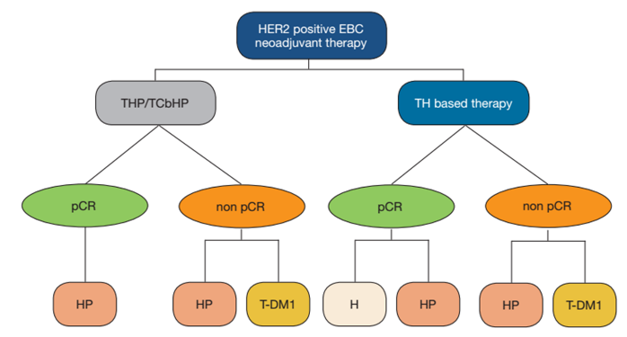 我国乳腺癌抗HER2治疗从无到有,已历二十余载,如今,抗HER2大分子药物、TKI药物、ADC药物风起云涌,似乎有一丝纷繁的意味。目之所至,曲妥珠单抗联合帕妥珠单抗的“曲帕双靶”方案,已高居HER2阳性乳腺癌新辅助治疗与高危患者术后辅助治疗的标准地位。以此为凭,2020年HER2阳性早期乳腺癌治疗,迎来最关键的进展——CSCO-BC、CBCS指南优化诊疗路径:新辅助治疗已然改变早期乳腺癌辅助治疗模式。术前未行新辅助治疗的患者,曲帕双靶为辅助治疗标准;术前行单靶治疗的患者,则凭疗效确定延续单靶抑或双靶升阶;若术前已然使用双靶的患者,则需考虑继续双靶或换用T-DM1辅助治疗。