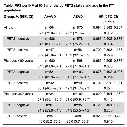 中位随访时间为60.9个月(95%置信区间[CI] 55.2-56.7),估计的5年PFS / INV率分别为A + AVD的82.2%(95%CI 79.0-85.0)和75.3%(95) ABVD的百分比CI为71.7-78.5)。研究者观察A + AVD相比ABVD表现出更好的PFS(危险比[HR] 0.681;95%CI 0.534-0.867;p=0.002)(表1)。在ITT人群中,估计的5年PFS中A + AVD vs ABVD在PET2阴性患者中为84.9%,而在PET2阴性患者中为78.9%(HR 0.663;95%CI 0.502-0.876;p=0.004);PET2-阴性患者中60.6%vs 45.9%。阳性(HR 0.702; 95%CI 0.393-1.255; p=0.229)。在A + AVD和ABVD组中,分别有85%和86%接受治疗的PN患者完全缓解或改善了症状。A + AVD组完成治疗后发生的PN事件的完全解决的中位时间是A + AVD组为34周(范围0-262),ABVD组为16周(范围0-267)。中位改善时间分别为49周(范围8-270)和12周(范围2-70)。A + AVD组中进行中的PN的最大严重程度为1级(17%),2级(9%),3级(3%)和4级(<1%),ABVD组中有1级(14%),2级(6%)或3级(1%)(总计= 21%)。继发性恶性肿瘤分别在A + AVD和ABVD组发生19点和29分。总共报告了131例怀孕。两组患者的持续妊娠或活产比例均相似(A + AVD和ABVD组分别为87%和75%)。