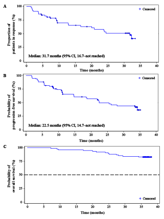 截至2020年8月31日,中位随访时间为36.2个月(范围7.2-38.1)。根据IRC评估,在57例患者中达到了客观缓解(76.0%;95%CI,64.7-85.1),与初步分析的结果相似。Kaplan-Meier估计的中位反应持续时间为31.7个月(95%CI,未达到16.7;图1A)。截止数据时,有50.7%的患者(38/75)病情恶化或死亡。中位无进展生存期为22.5个月(95%CI,未达到14.7;图1B)。发生了十三例(17.3%)死亡,并且未达到中位总生存期(图1C)。36个月的OS率为82.7%(95%CI,72.0-89.5)。
