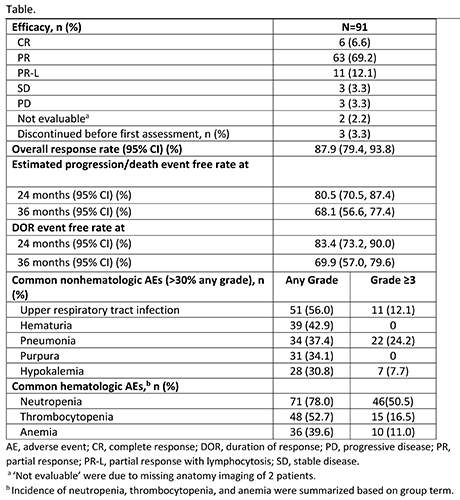 【研究方法】本研究是一项单臂、多中心、II期临床研究(NCT03206918),入组的R/R CLL/SLL患者接受泽布替尼160mg 一日两次,直至疾病进展或不可耐受。主要研究终点为独立审查委员会(IRC)依据国际CLL协作组相关指南(Blood. 2008;111:5446)或Lugano CLL/SLL分类(J Clin Oncol. 2014;32:3059)评价的总反应率(ORR)、缓解持续时间(DOR)、无进展生存(PFS)和安全性。