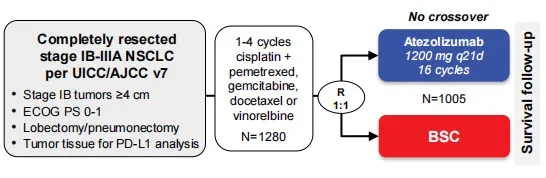 在PD-L1阳性II~IIIA期非小细胞肺癌 (NSCLC) 患者中,辅助阿替利珠单抗(atezolizumab)相比最佳支持治疗 (BSC) 提高了无病生存 (DFS),