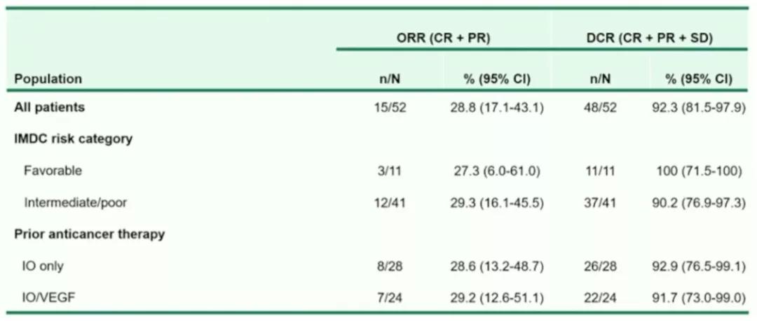 方法:入组患者为晚期肾透明细胞癌,既往接受过免疫治疗以及≤2种全身治疗方案。研究开始时,安全审查委员会对两个队列中的前6名患者进行了21天的评估,以确定Ⅱ期推荐剂量(RP2D)。主要终点为根据RECIST v1.1评估的ORR(CR+PR)。次要终点为DCR(CR+PR+SD)、DOR、PFS和OS。在此初步分析中,对接受过≥1次治疗剂量且有机会进行≥6个月随访的患者进行了疗效评估。对所有患者进行安全性评估。