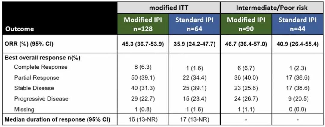 共有192例患者(69.8%为中/低风险)至少服用了一剂研究药物。与常规IPI(Q3W)相比,改良IPI(Q12W)患者的G3/4 TRAE率显著降低(32.8% vs 53.1%;OR 0.43,90%Cl:0.25~0.72;P=0.0075)。图5给出了疗效终点,治疗组和预先指定的IMDC风险亚组之间的疗效相似。