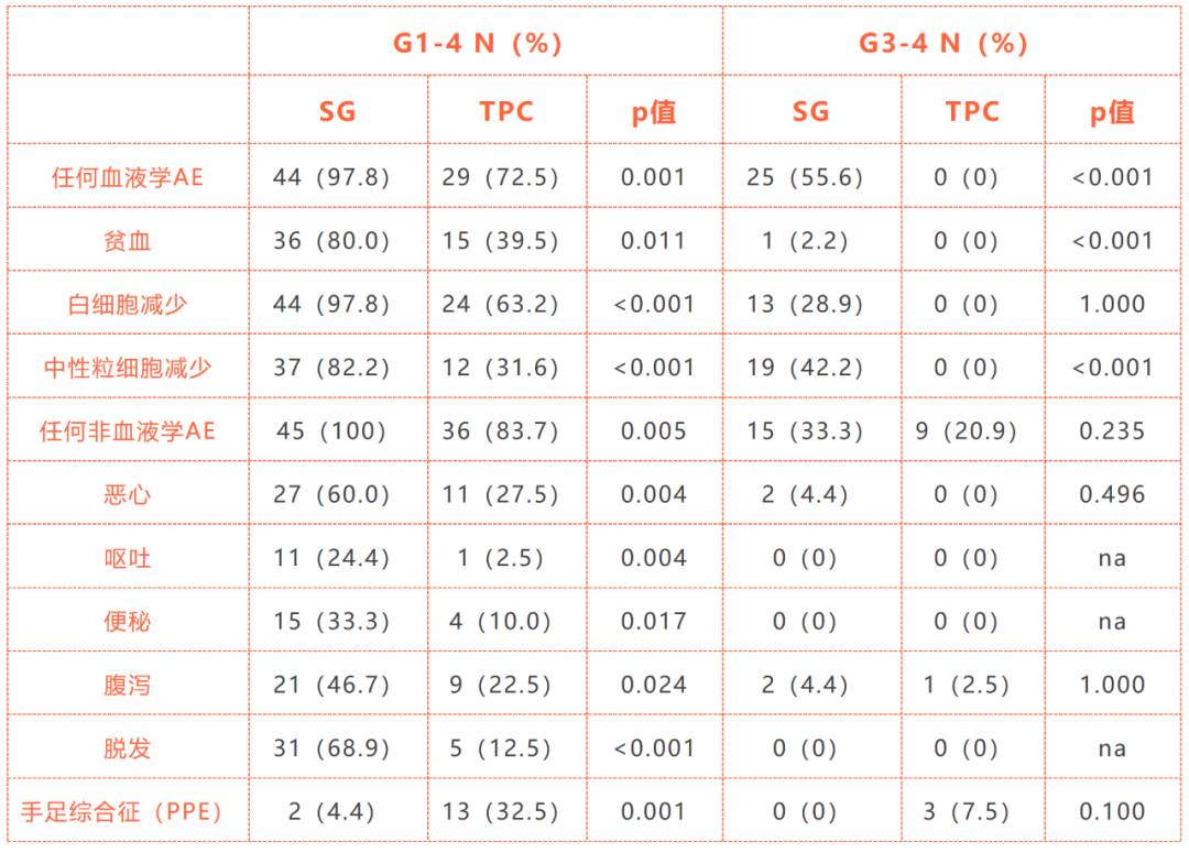 sacituzumab govitecan组AE G1-4患者为45例(100%),TPC组AE G1-4患者为37例(86.0%);sacituzumab govitecan组AE G3-4患者为30例(66.7%),TPC组为9例(20.9%)。两组无死亡病例发生。
