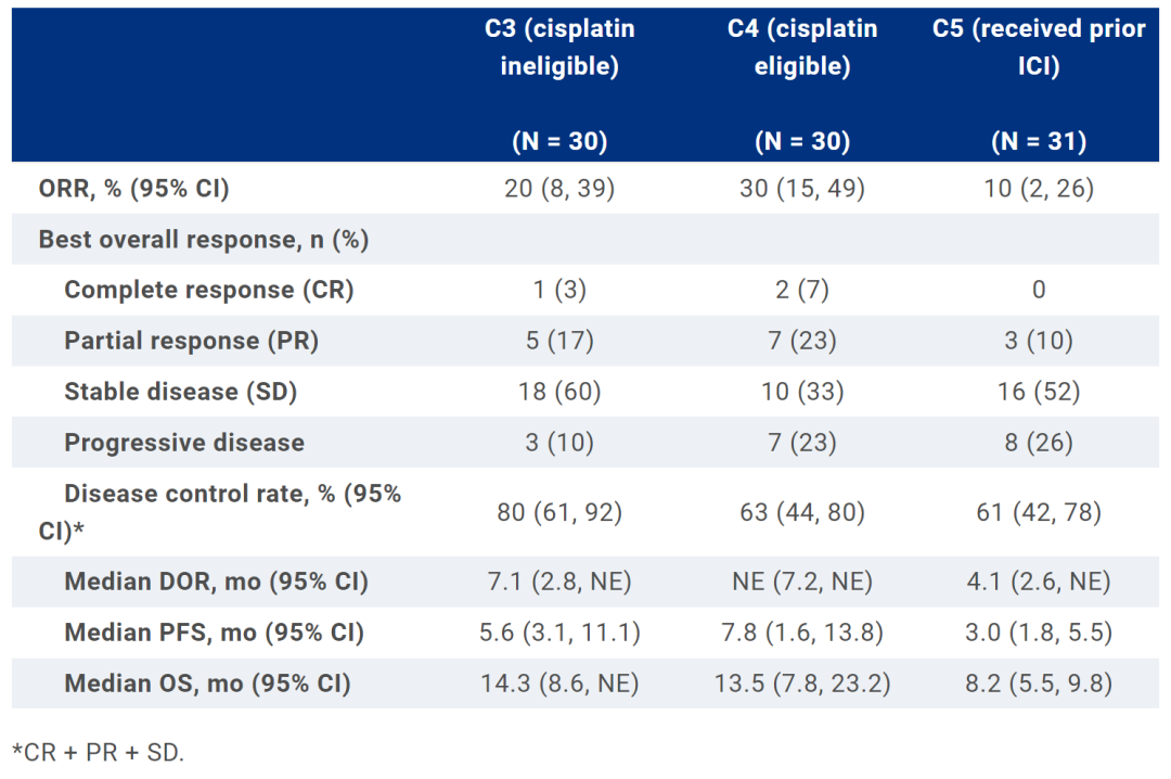 C3和C4各入组30名患者,C5入组31名。C3、C4和C5的基线特征分别为:中位年龄74岁、66岁、68岁;男性67%、73%、55%;ECOG PS 1分别为63%、57%、74%;肺/肝转移比例分别为33%/17%、40%/20%、58%/23%;≥3个肿瘤部位分别为30%、43%、45%;膀胱为原发部位者分别为67%、70%、71%。截至2021年11月30日,C3、C4和C5的中位随访时间分别为27.9、19.1和32.9个月,分别有1、6和1名患者正在接受治疗。