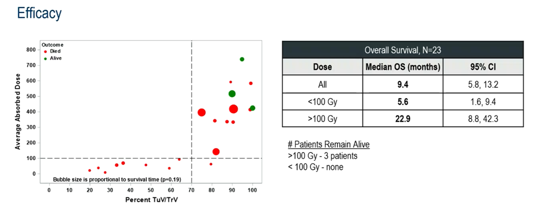研究共纳入21例患者,分为6个剂量组(1.0-22.3mCi,0.6-8.8mL)。患者的平均肿瘤体积为8.3mL。患者的平均复发病灶数为1.7,预后不良。肿瘤的平均吸收辐射剂量(MARDT)为271Gy,全身暴露可忽略不计。无剂量限制毒性,总体安全性良好。