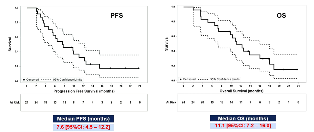 中期分析显示,中位PFS为7.6个月(95%CI:4.5~12.2),中位OS为11.1个月(95%CI:7.2-16.0)。队列A达到主要终点,9个月OS率为67%(95%CI:44%-82%)。未观察到剂量限制毒性。仅发生2起与治疗相关的3级毒性(肌炎和高血压)。
