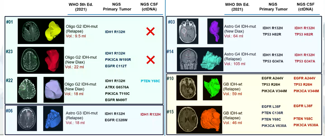 这项来自西班牙马德里的前瞻性研究,通过高通量下一代测序(NGS)对患者CSF、石蜡块包埋组织(FFPE)和/或新鲜肿瘤样本进行ctDNA检测,测序使用的是一个8个基因(IDH1、IDH2、ATRX、TP53、PTEN、PIK3CA、EGFR、BRAF)的定制基因板。
