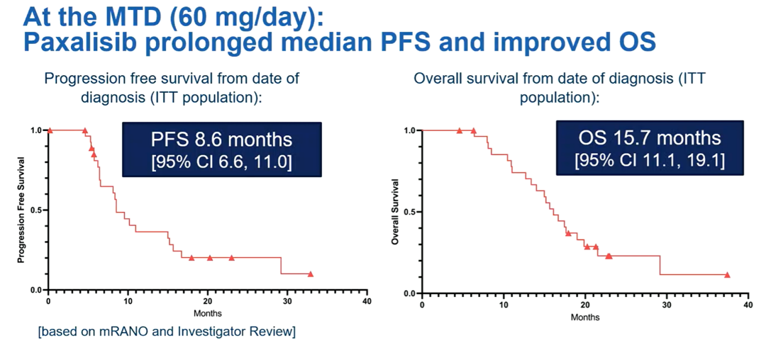 研究共纳入30例患者,70.0%为男性,平均年龄58.5岁,共接受1至29个治疗周期。接受最大耐受剂量(MTD,60mg/天)Paxalisib治疗的患者,RANO和mRANO评估的中位PFS分别为8.4个月和8.6个月,中位OS为15.7个月。