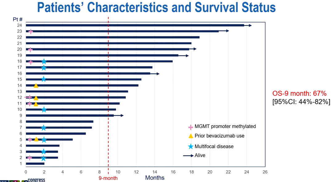 此次报告队列A中期分析结果,共入组25例rGBM患者,其中23例可评估。中位年龄为64.3岁(42.1-81.8),30.4%为女性,30.4%存在MGMT启动子甲基化,中位KPS评分为90(范围:70-100),基线地塞米松0 mg(范围0-4),基线ALC为1000个细胞/μl(范围300-3700)。患者迄今为止接受了中位6个周期(范围2-20)的治疗。中位随访时间为11.97个月。