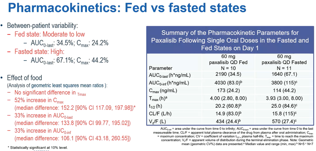 PK分析显示,Paxalisib可被稳定吸收(给药后中位Tmax为2.5和4小时),并下降,平均消除半衰期为20.2~29.0小时。平均半衰期(20.2~29.0小时)在不同剂量水平,以及进食和禁食条件下均相似。与60 mg禁食状态相比,60 mg喂食状态下Paxalisib的全身暴露量略高。在90%水平下,喂食与禁食状态下的Cmax具有统计学差异(AUC0-last 1.33, AUC0-inf 1.06,Cmax 1.52)。在10例患者接受FDG-PET检查的患者中,有8例(80%)在第1周期第3天和/或第7天表现FDG摄取减少,4例(40%)出现代谢部分缓解。