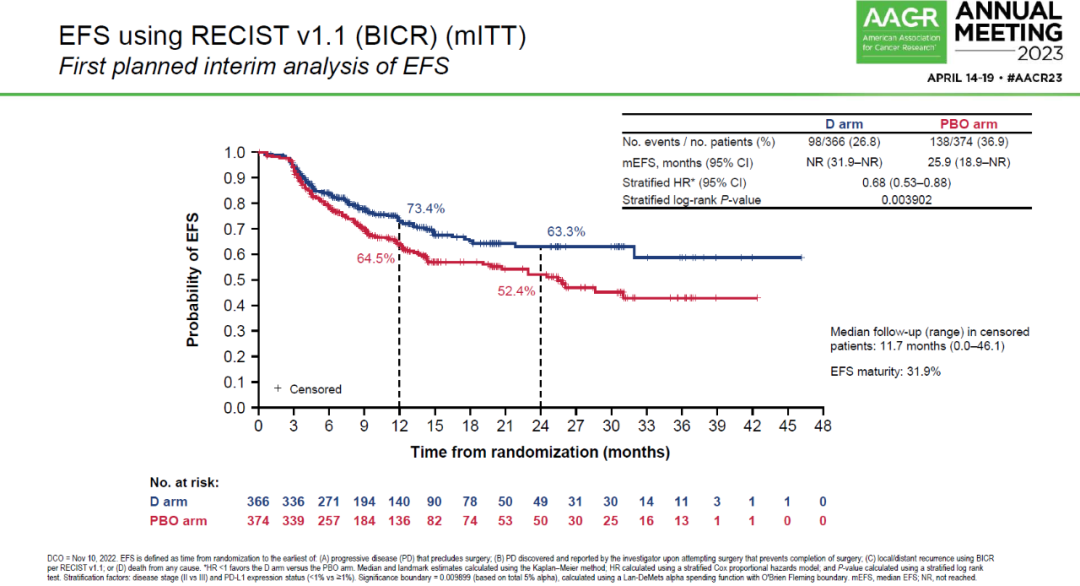中位随访11.7个月(范围:0.0~46.1个月)时,成熟度31.9%,中位EFS在度伐利尤单抗组未达到(NR;95%CI:31.9-NR)vs安慰剂25.9个月(95%CI:18.9-NR)(分层HR=0.68;95%CI:0.53~0.88;P=0.003902);度伐利尤单抗组12个月和24个月EFS率分别为73.4%和63.3%,安慰剂组分别为64.5%和52.4%。