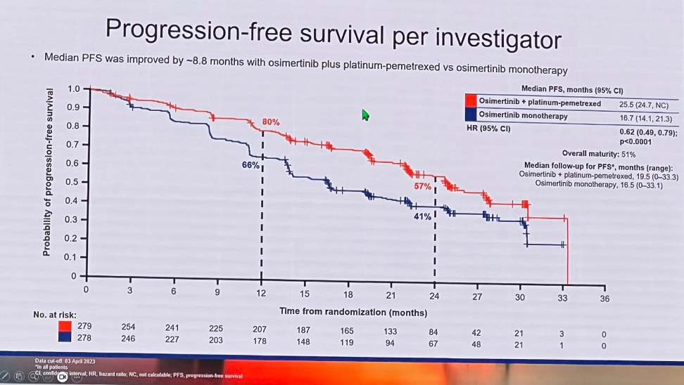 研究结果表明,奥希替尼联合化疗可显著改善PFS,与奥希替尼单一疗法相比,疾病进展风险显著降低。数据显示,中位PFS延长了8.8个月(25.5 vs.16.7个月),PFS的风险比(HR)令人信服,为0.62(95%CI:0.49-0.79;p<0.0001)。根据盲法独立中央审查(BICR),联合治疗组相比单药治疗组的PFS改善为9.5个月(29.4 vs.19.9个月)。
